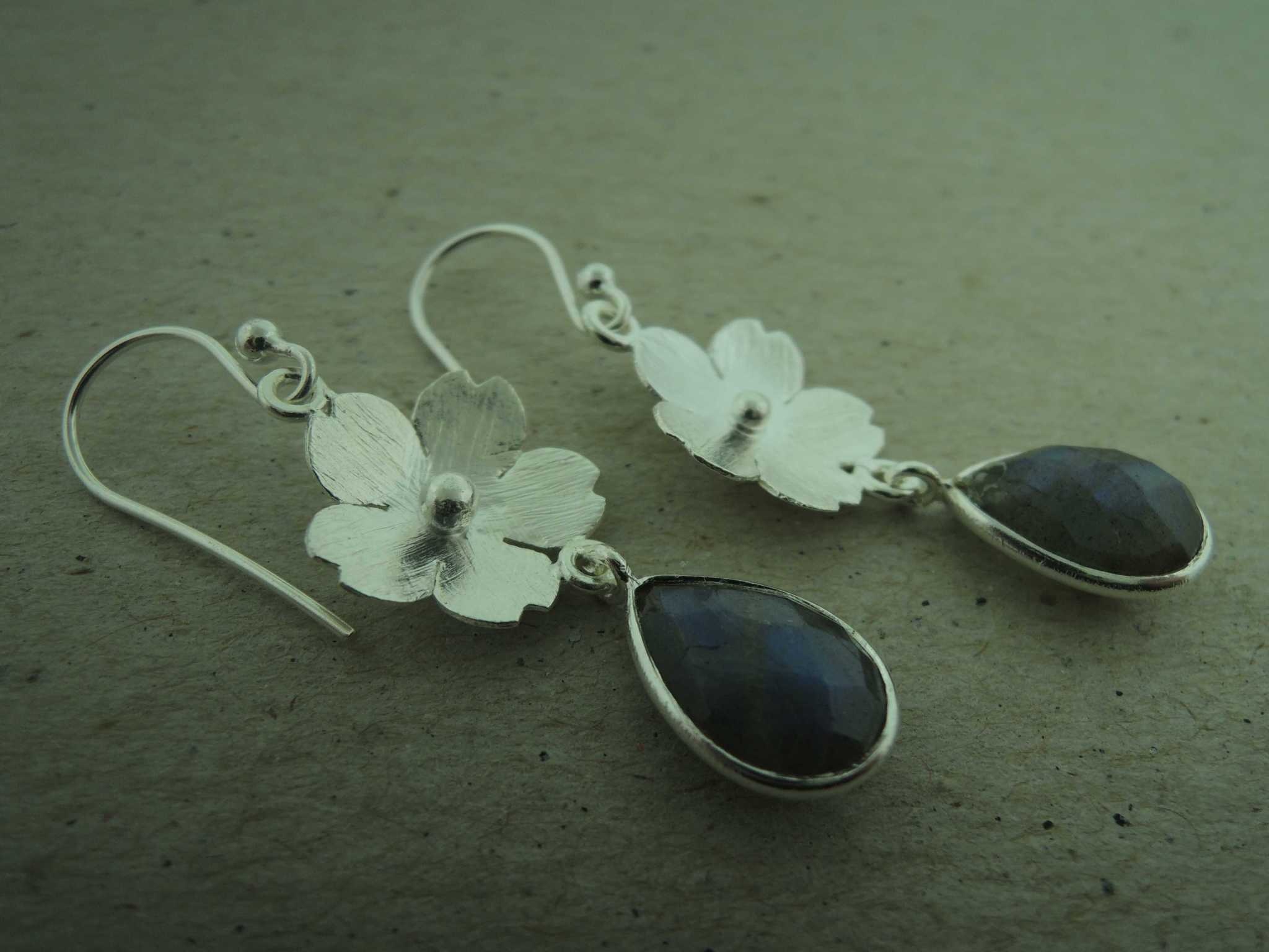 OZ0912 OORHAAK Ag925 LABRADORIET GRIJS 4CM BLOEM/DRUPPEL