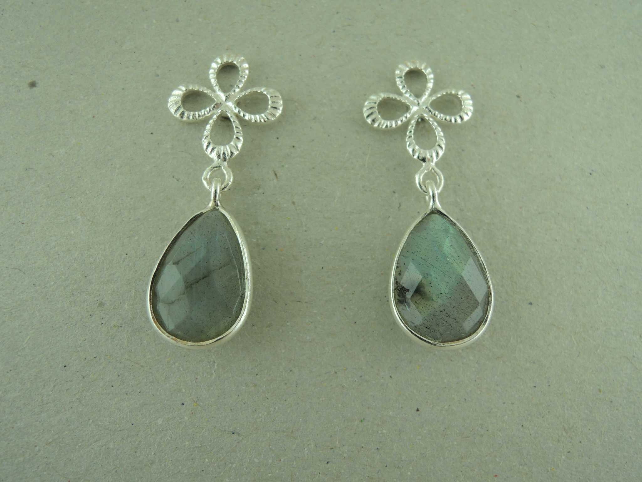 OZ0946 OORSTEKER Ag925 LABRADORIET GRIJS 3CM 12MM BLOEM + 15MM DRUPPEL